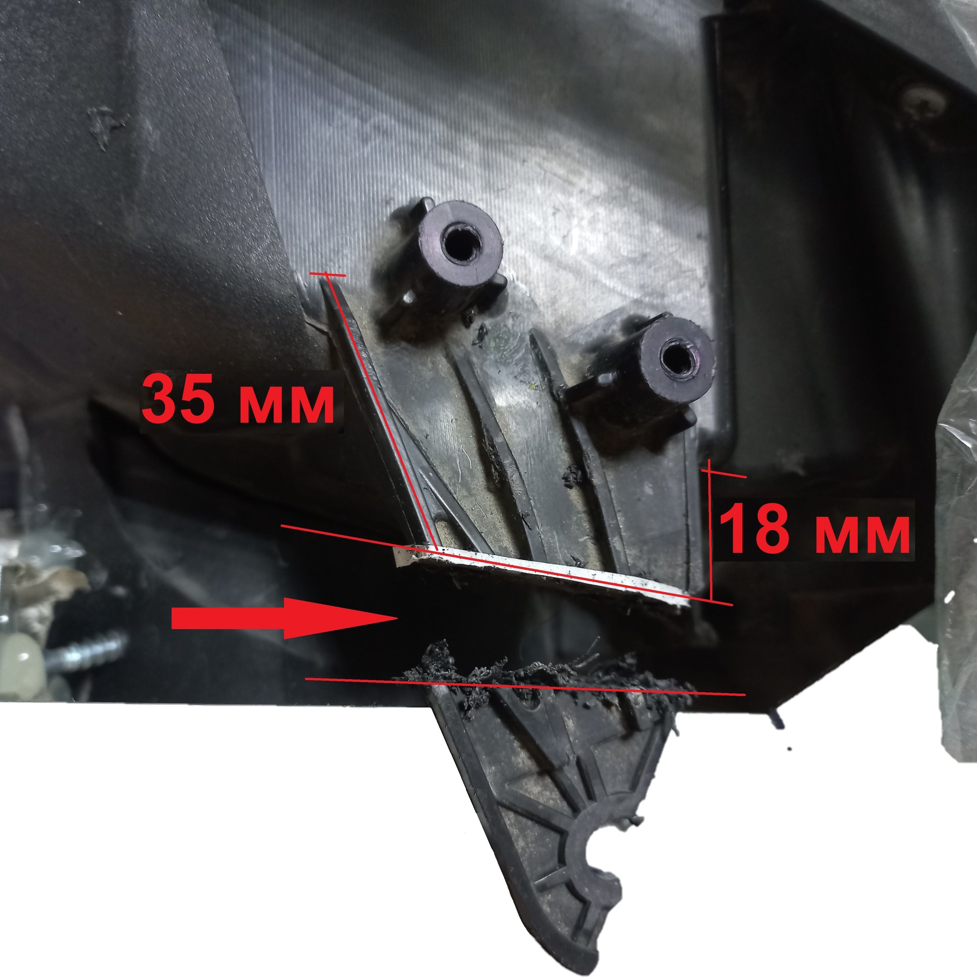 года выпуска. Для установки ремонтного кронштейна необходимо удалить поврежденное крепление фары, для чего примерить ремонтный кронштейн к месту установки, срезать мешающие остатки оригинального крепления строительным ножом. Кронштейн устанавливается в заводские посадочные места и фиксируется саморезами.
