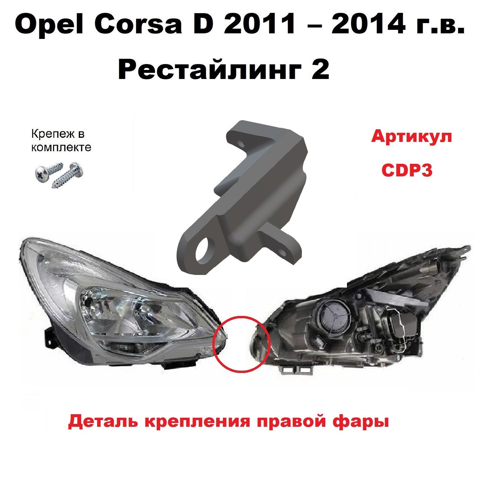 Предназначен для ремонта оригинальной автомобильной фары Opel Corsa D 2011-2015 Рестайлинг 2 (2011-2015) года выпуска. Устанавливается в штатные крепежные места, фиксируется шурупами.