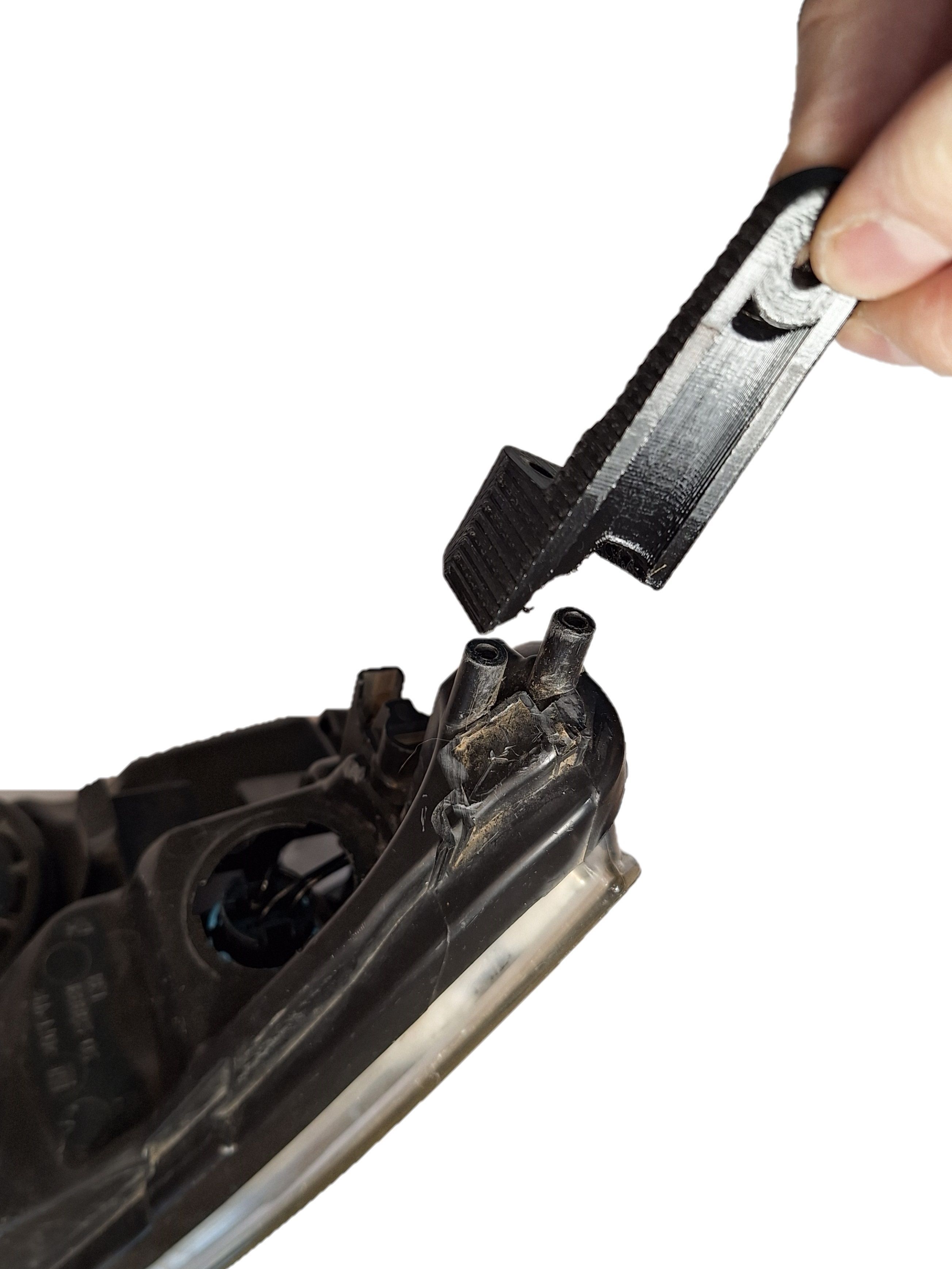 Для установки ремонтного кронштейна необходимо удалить поврежденное крепление фары, для чего примерить ремонтный кронштейн к месту установки, срезать мешающие остатки оригинального крепления строительным ножом. Кронштейн устанавливается в заводские посадочные места и фиксируется саморезами.