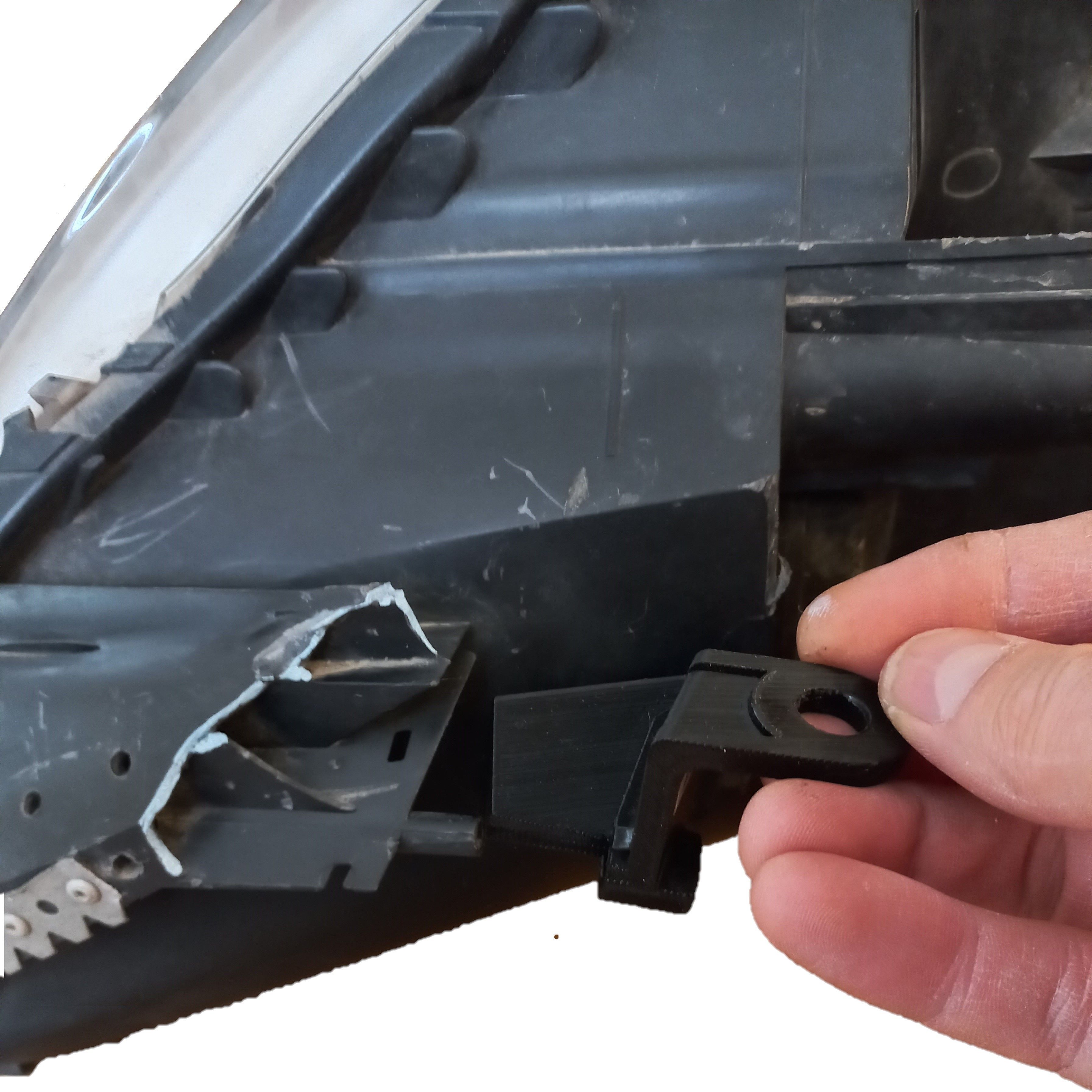 Для установки ремонтного кронштейна необходимо удалить поврежденное крепление фары, для чего примерить ремонтный кронштейн к месту установки, срезать мешающие остатки оригинального крепления строительным ножом. Кронштейн устанавливается в заводские посадочные места и фиксируется саморезами.